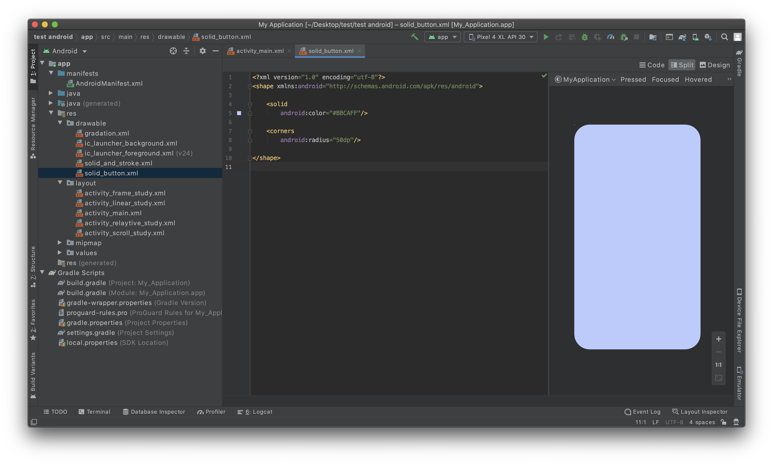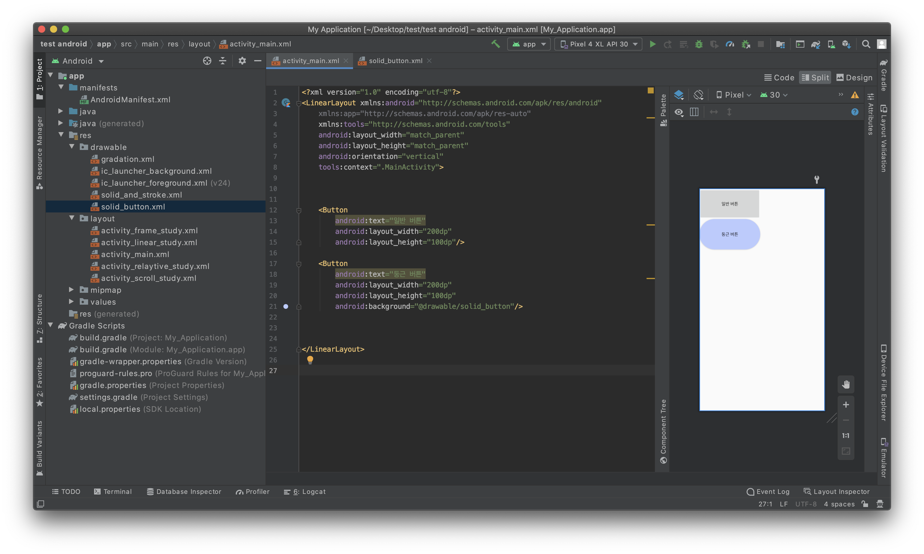 Drawable에 xml파일을 만들어주어 버튼 모양을 만들어줍시다!